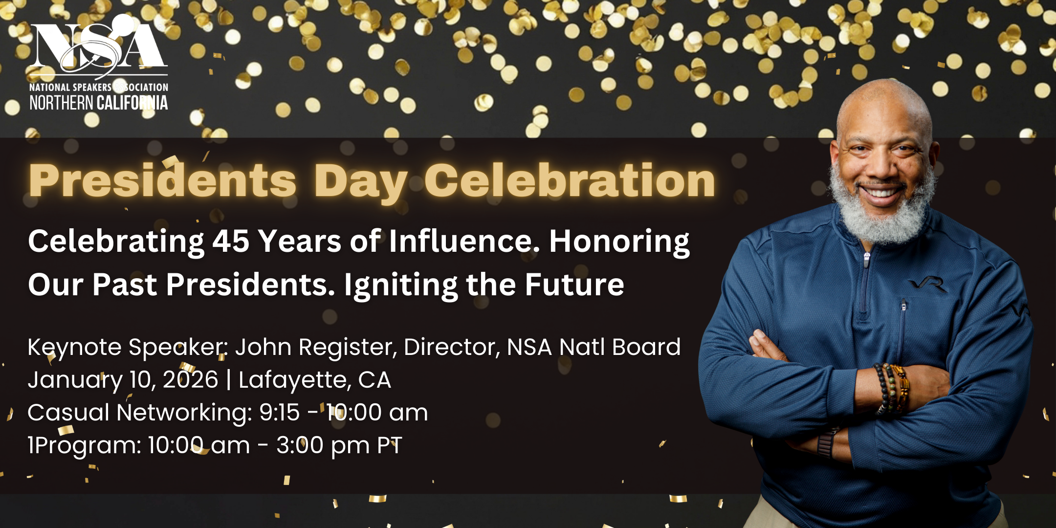 We are honored to feature John Register, CSP, CPAE, world-renowned keynote speaker, Paralympic medalist, and member of the NSA National Board. His message of resilience, possibility, and purpose will set the tone for a celebration like no other.