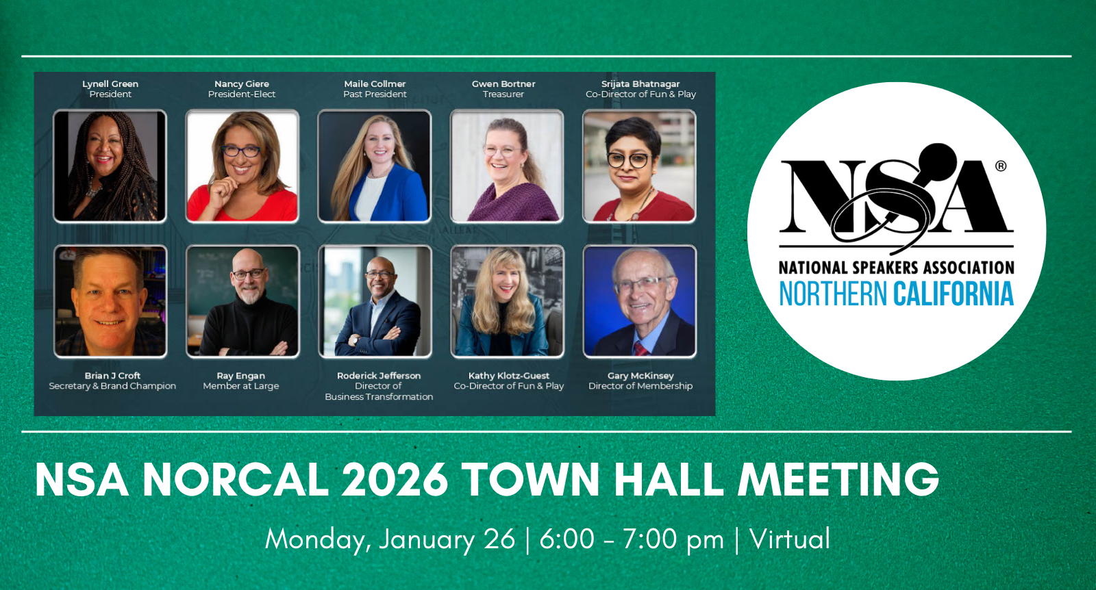 The National Speakers Association of Northern California invites you to our Members only Town Hall Meeting. A space created for transparency, connection, and community conversation.